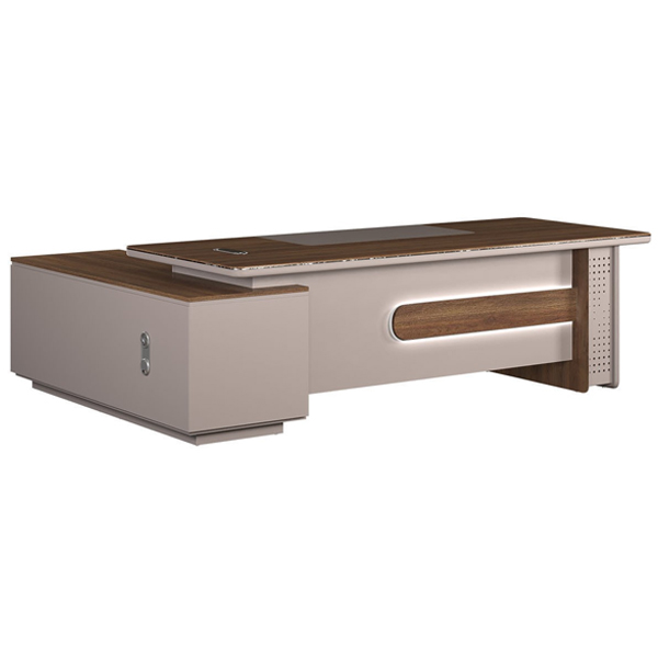 - Yếm bàn được ốp nổi bật, có vị trí gắn đèn LED trang trí, tạo điểm nhấn tinh tế, thể hiện phong thái quyền lực của người lãnh đạo.